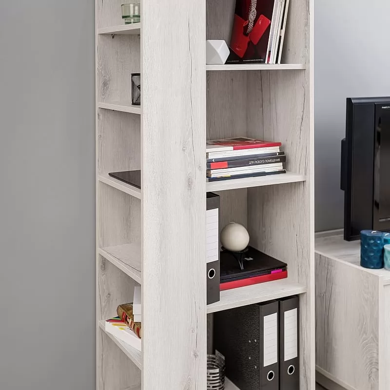 Открытый стеллаж с торцевым отделением ФЛЕКС 26 в светлом цвете Дуб Шавиниган выполнен из ЛДСП класса эмиссии Е1 толщиной 16 мм. На небольшие торцевые полки можно поставить коллекцию книг или сувениров. Такая открытая этажерка дополнит систему хранения в любой комнате: в гостиной, спальне, молодежной и прихожей. Бортики вверху по краям в одном стиле с коллекцией Флекс. Предусмотрена правосторонняя и левосторонняя сборка модуля.
