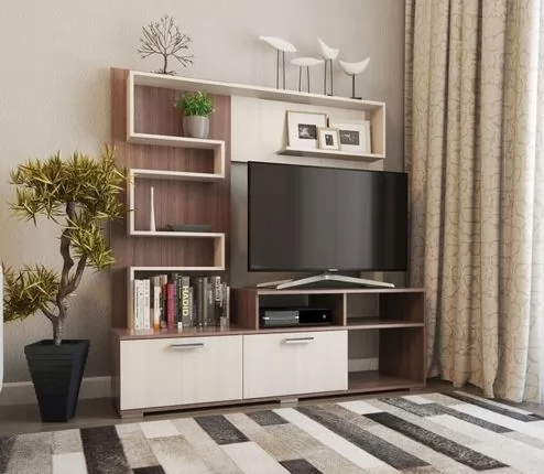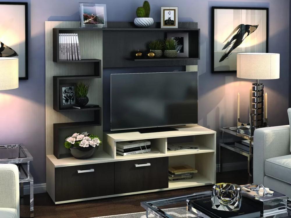 • Компактная и функциональная стенка для небольшой гостиной, выполненная в контрастных древесных расцветках.