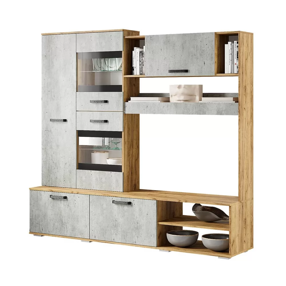 -высококачественное ЛДСП цвета крафт сочетается с фасадами, эмитирующими бетонную поверхность,