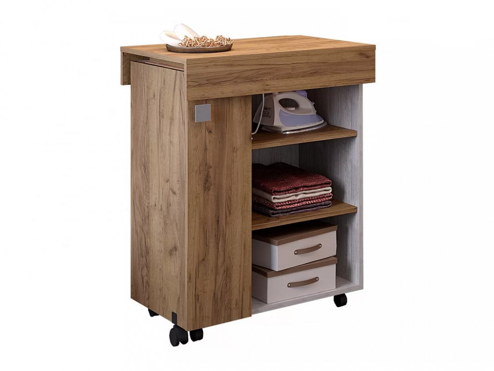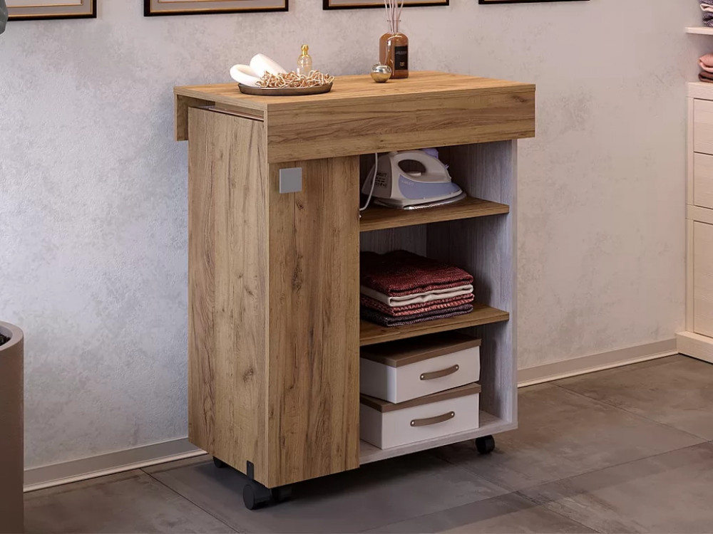- изделие дополнено полками, на которых можно хранить утюг и необходимые вещи, а также колесиками для большей мобильности,