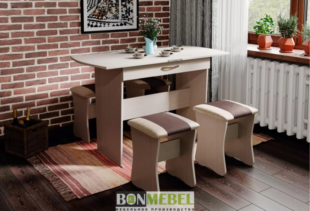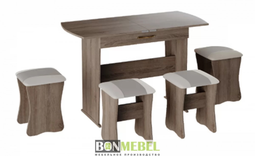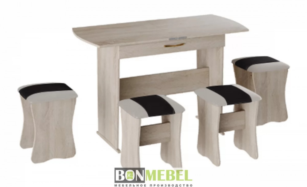 Обеденная группа с табуретами Тип-2 станет практичной и уютной обеденной зоной для вас и ваших гостей. Комплект рассчитан на четыре персоны. Встроенный механизм трансформации позволит увеличить ширину стола почти с 750 мм до 1200 мм. Обивка из экокожи устойчива к различным загрязнениям и не требует обработки специальными средствами. Мягкие сиденья табуретов имеют мягкое и упругое наполнение, что повышает уровень комфортабельности. Различные варианты расцветки помогут подобрать идеальный комплект. Для изготовления изделий используется прочная ЛДСП. Обивка табуретов выполнена из искусственной кожи.
