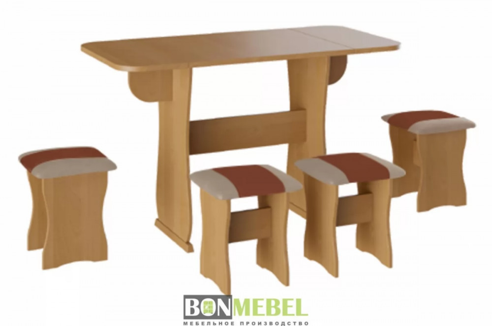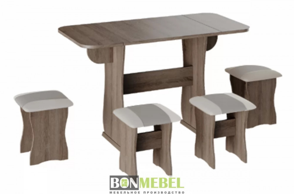 Обеденная группа с табуретами Тип-4 поможет стильно и практично оформить пространство даже на малогабаритной кухне. Комплект рассчитан на четыре персоны. Раскладной стол позволит увеличить ширину стола почти на 55 см за считанные секунды. Обивка из экокожи устойчива к различным загрязнениям и не требует обработки специальными средствами. Мягкие сиденья табуретов имеют мягкое и упругое наполнение, что повышает уровень комфортабельности. Различные варианты расцветки помогут подобрать идеальный комплект. Для изготовления изделий используется прочная ЛДСП. Обивка табуретов выполнена из искусственной кожи.