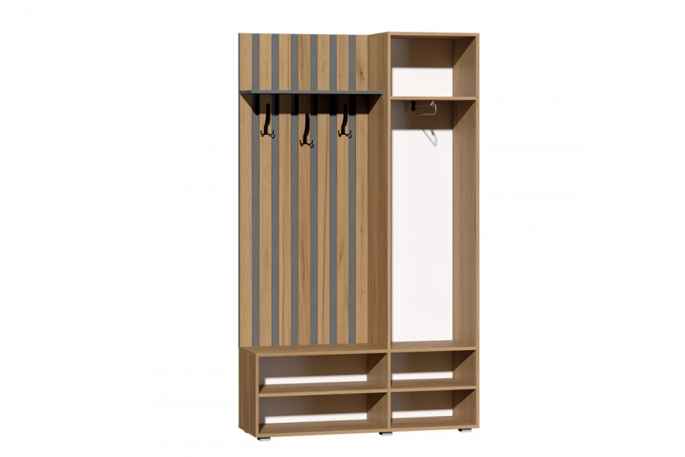 Очень функциональная прихожая, выполненная в современном сочетании теплой древесной текстуры с глубоким серым цветом - дуб крафт золотой с графитом. Ширина отдела с крючками - 70 см, где удобно размешать верхнюю одежду. В отделе со створкой имеется выдвижная штанга размером 350 мм и ниша для размещения шапок, перчаток, шарфов и прочего Контрастные черные ручки размером 128 мм. В нижней части прихожей открытые ниши для обуви. Современной оформление открытой части с крючками - эффект реек на фоне заднего щита из контрастного цвета материала.