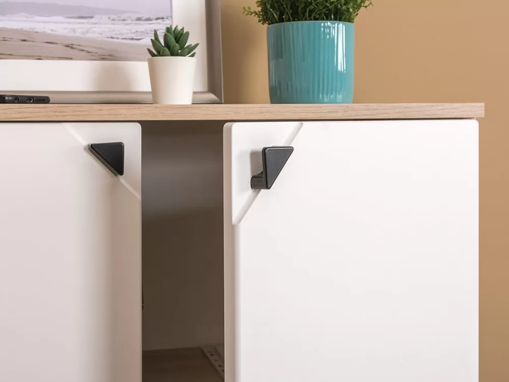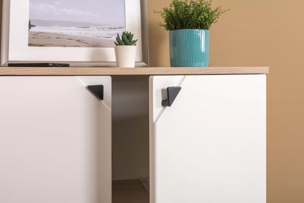 Распашные двери на четырёхшарнирных петлях. Пластиковые опоры высотой 2 см. Ручки: металл, черный матовый.