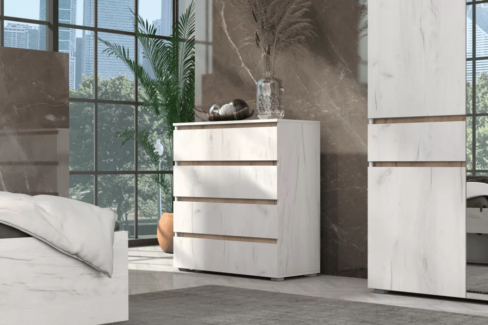Изящная и функциональная спальня "Лиана" выполнена в модном цвете ЛДСП крафт белый с контрастными вставками цвета графит, либо крафт золотой. Выдвижные ящики комода "Лиана" снабжены шариковыми направляющими полного выдвижения, что обеспечивает плавность хода и удобство пользования.