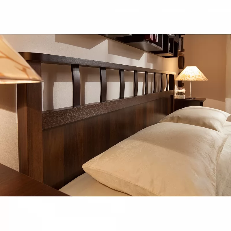 Кровать с решеткой в изголовье - это серия Люкс в коллекции для спальни Sherlock. Именно такую кровать, в стиле викторианской старой Англии, можно назвать кроватью джентльмена: ничего показного, только благородные оттенки и фактуры, долговечные натуральные материалы. Решетка изготовлена из окрашенного массива дерева. Рекомендуемая высота матраса - до 23 см. Он "утопает" в корпус кровати на 4,5 см. Верхняя фигурная планка на изголовье выполнена из ЛДСП 22 мм шириной 7 см. Высота проема от пола до царги составляет 16 см. Данная кровать рассчитана под стационарное ортопедическое основание с гибкими фанерными ламелями с корпусом из металла или дерева. Последнее стоит дешевле, экологично и выдерживает бОльшую нагрузку по сравнению с металлическим (440 кг распределенной нагрузки с учетом веса матраса против 300 кг).