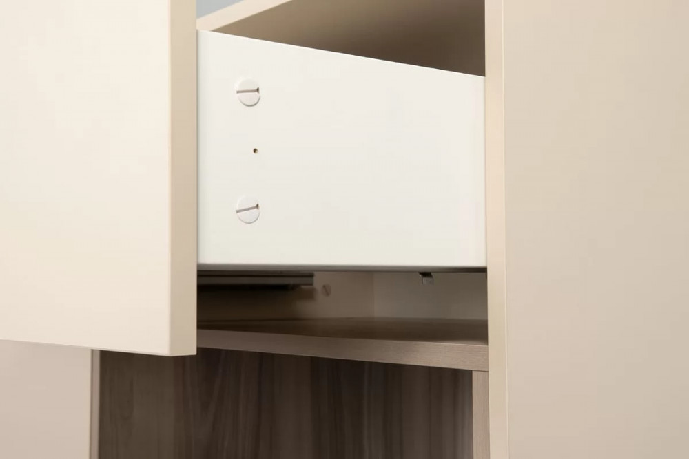 Фасады с механизмом push-to-open, направляющие скрытого монтажа, петли с доводчиками, утолщённая кромка – комфорт продуман до мелочей.