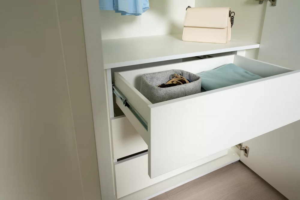 В изголовье кровати предусмотрены вместительные ниши. Шкафная группа полноценной глубины
