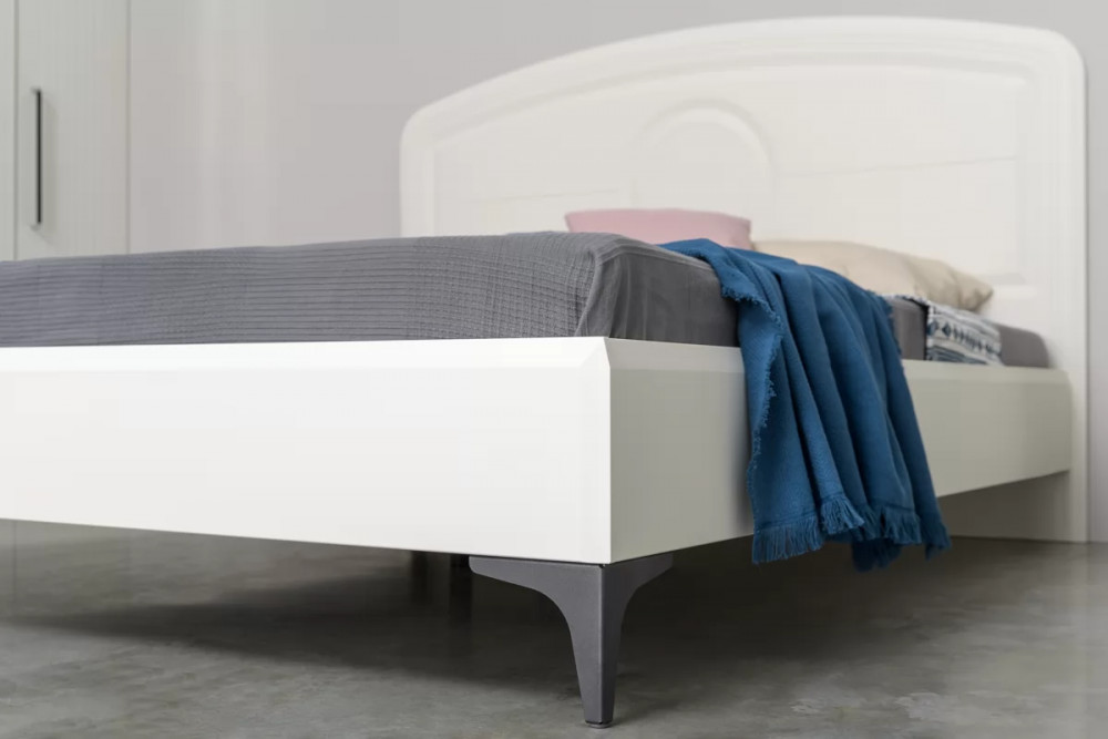 • Кровать установлена на высокие ножки, что делает конструкцию лёгкой и воздушной, изголовье кровати декорировано пышным мягким элементом.