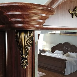 Спальный гарнитур выполнен в классическом стиле. Это изысканный дизайн с резными элементами и декором. Овальное изголовье, рисунки на фасадах, придают мебели для спальни эффект дороговизны и благородства. Такая спальня способна восхищать и удивлять.  Вы можете приобрести как весь комплект, так и по отдельности. Изделия отвечают  всем стандартам и имеют длительный срок эксплуатации.